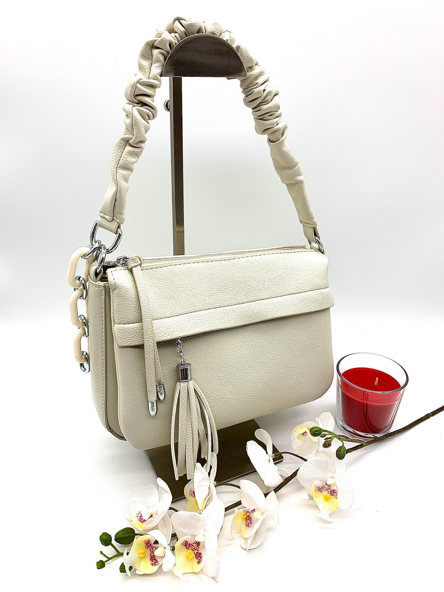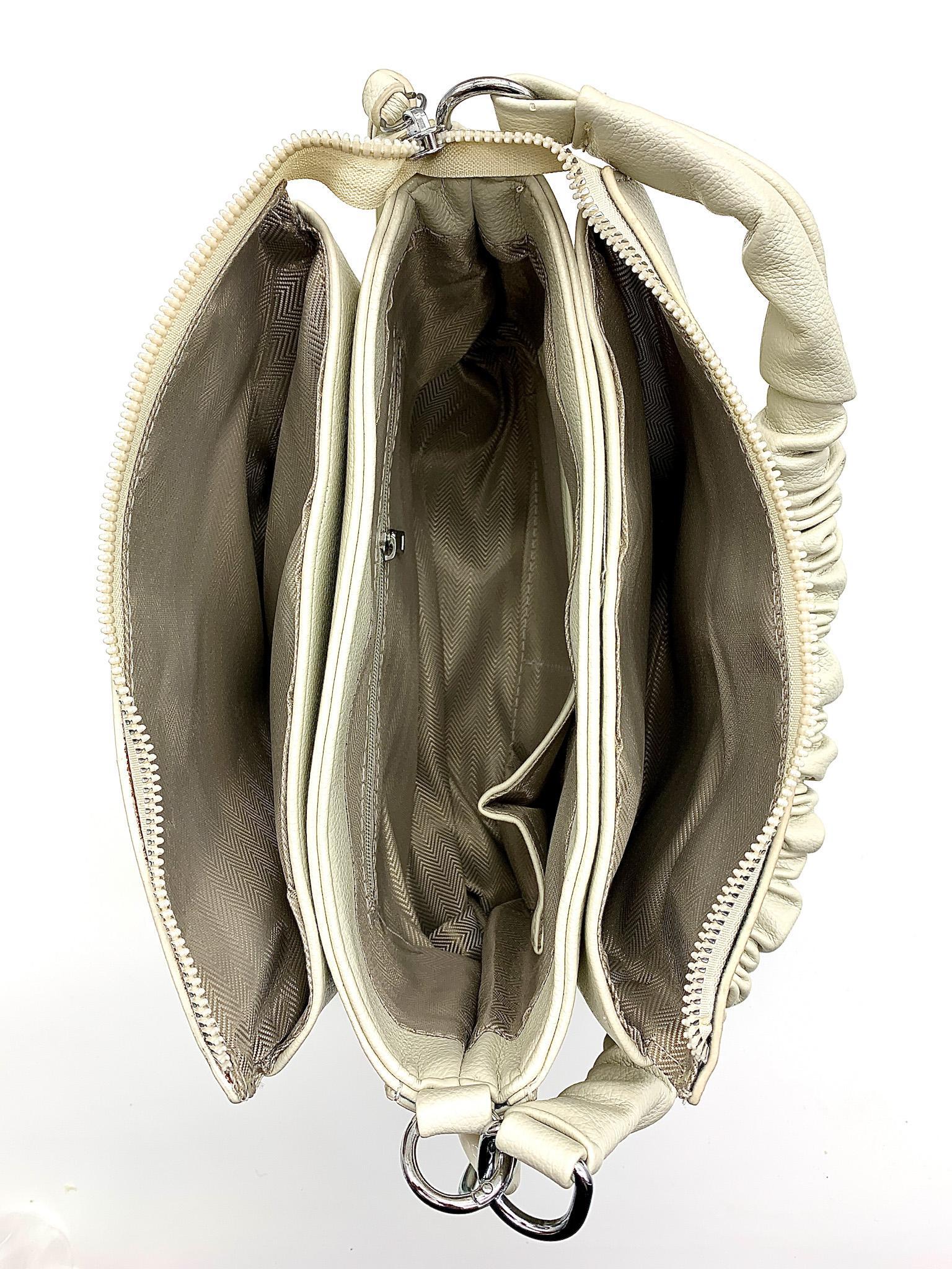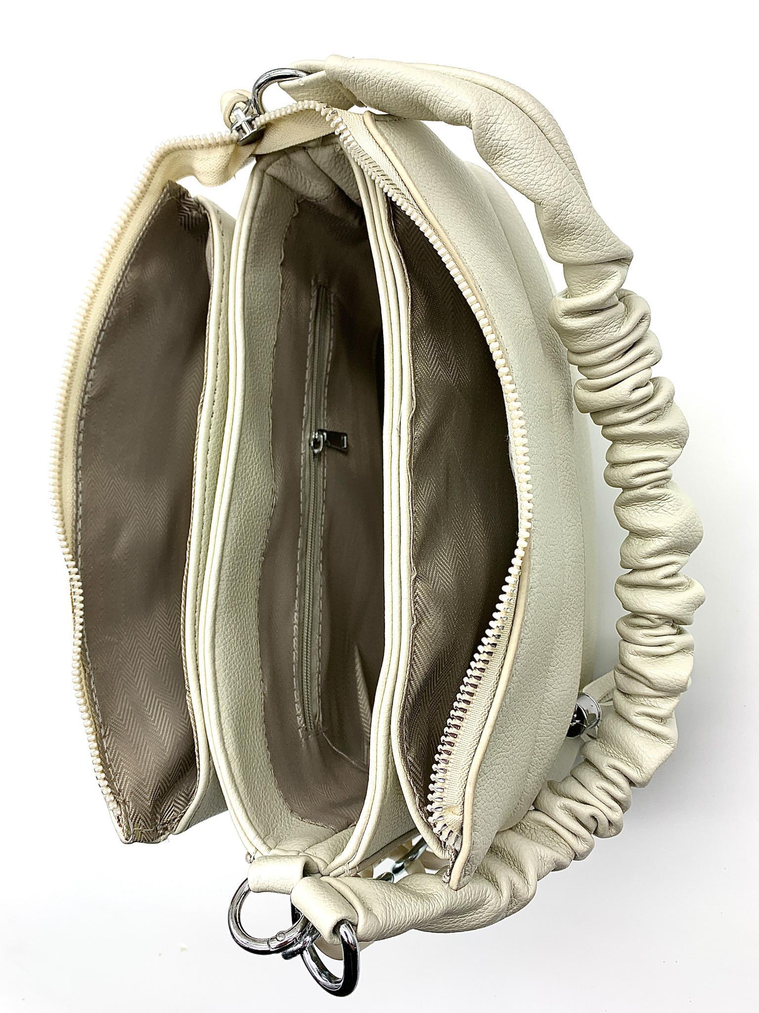 Элегантная повседневная сумка из мягкой экокожи. Оригинальная фурнитура - металл под серебро, два съемных ремешка, три удобных отделения. Потайной карман на молнии и мини карманы для телефона и мелочей. На задней стороне практичный карман на молнии. Сумка для стильных женщин, предпочитающих современную классику!